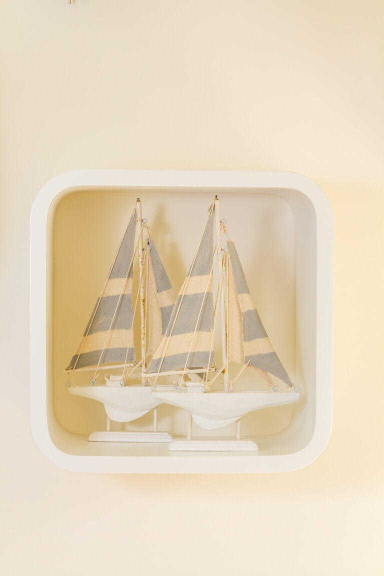 חדר בעל גג משופע ודלתות זכוכית ארוכות הפונות אל מרפסת קטנה. בחרנו לעצב לגיא חדר בסגנון ימי. על הקיר שאליו הצמדנו את המיטה הדבקנו טפט סירות תכלכל, על הקירות האחרים הדבקנו טפט פסים בצבעי כחול ותכלת, שאותו תחמנו בעזרת קרניז לבן, ותלינו וילון רומאי כחול מעל דלתות היציאה למרפסת. הוספנו כריות בכחול ולבן ותלינו על הקיר קוביות מדפים לבנות שבהן הנחנו פרטי דקורציה ימיים. בגלל אהבתו של גיא לכדורגל הוספנו לחדר כדורגל בד המתפרק לכורסה ולהדום.