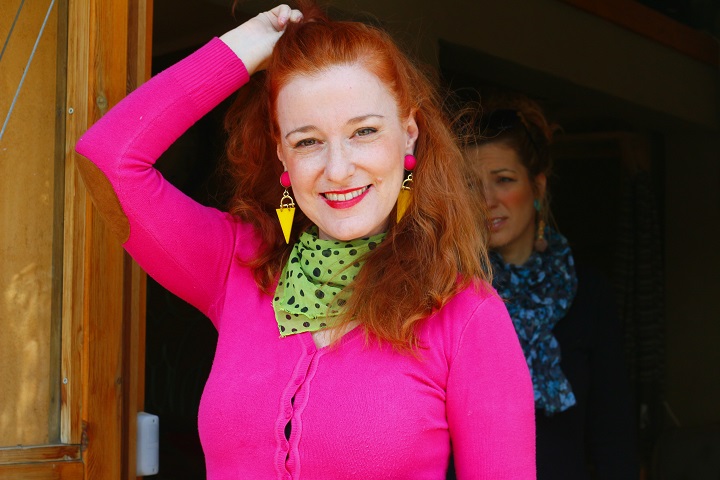 קרדיגן ורוד עם צעיף ירוק מנוקד