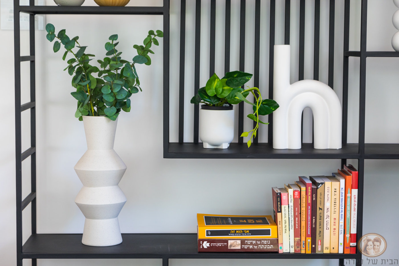 להלבשת הסלון בחרנו בשילוב של גוונים רכים וניטרליים, וברהיטים עשויים עץ ומתכת; לצד הספה העמדנו ספרייה מברזל שחור, והוספנו שולחן נקי שאותו הנחנו במרכז השטיח הרך והגדול. את ספת אודרי שלנו ריפדנו בבד בגוון גרז (שילוב של אפור ובז’). הוספנו שתי כורסאות אודליה מעוגלות עשויות עץ אלון, וכורסת אשלי מרווחת ונוחה במיוחד, מסוג לאב סיט. את הצבע הוורוד, ואת המראה המתוחכם, הוספנו בבדי הריפוד. להשלמת האווירה הוספנו פריטי נוי לבנים, וכמובן צמחייה.