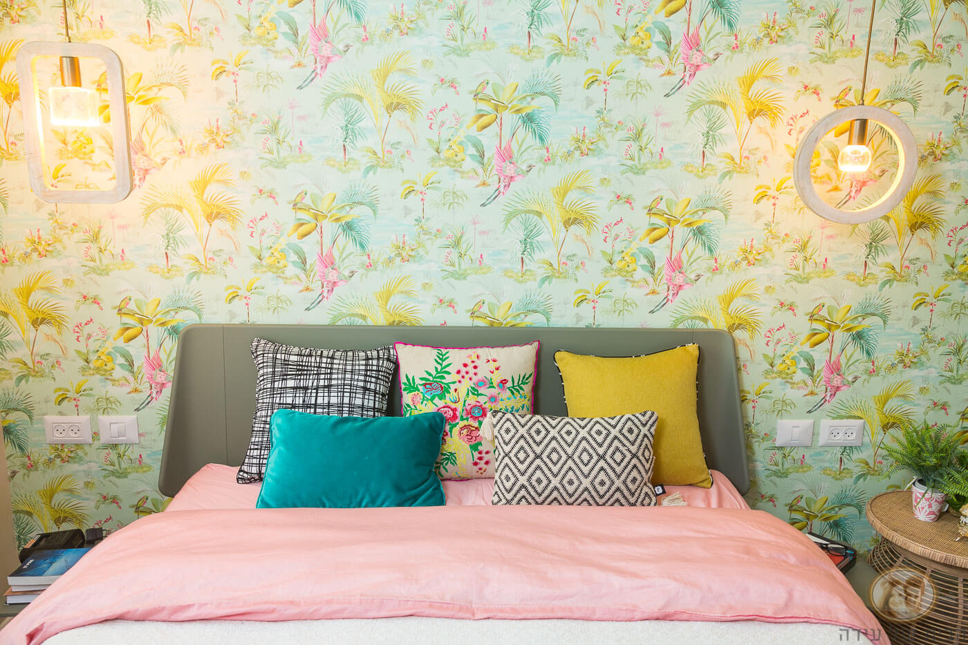 גם לעיצוב חדר השינה שלה בחרה פנינה בצבע הירוק, אלא שהפעם העדיפה מראה מרוכך ורומנטי יותר; בחרנו להדביק על קיר המיטה טפט טרופי ושמח בירוק בהיר, שעליו מודפסים פרחים וציפורים אקזוטיות. לצד הקיר העמדנו מיטה בעלת קווים נקיים (הולנדיה), ושולחן צד עגול עשוי קש. תלינו על התקרה שני גופי תאורה רמנטיים בעלי גוף עשוי עץ, האחד עגול והשני אליפטי. השארנו את ארון הבגדים של פנינה ומוטי, קלטתן שיש לו דלתות שקופות?! (מתאים לנשים מסודרות במיוחד ?)