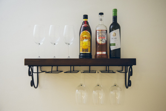 תלינו על הקיר מדף עם בקבוקי אלכוהול יין וכוסות